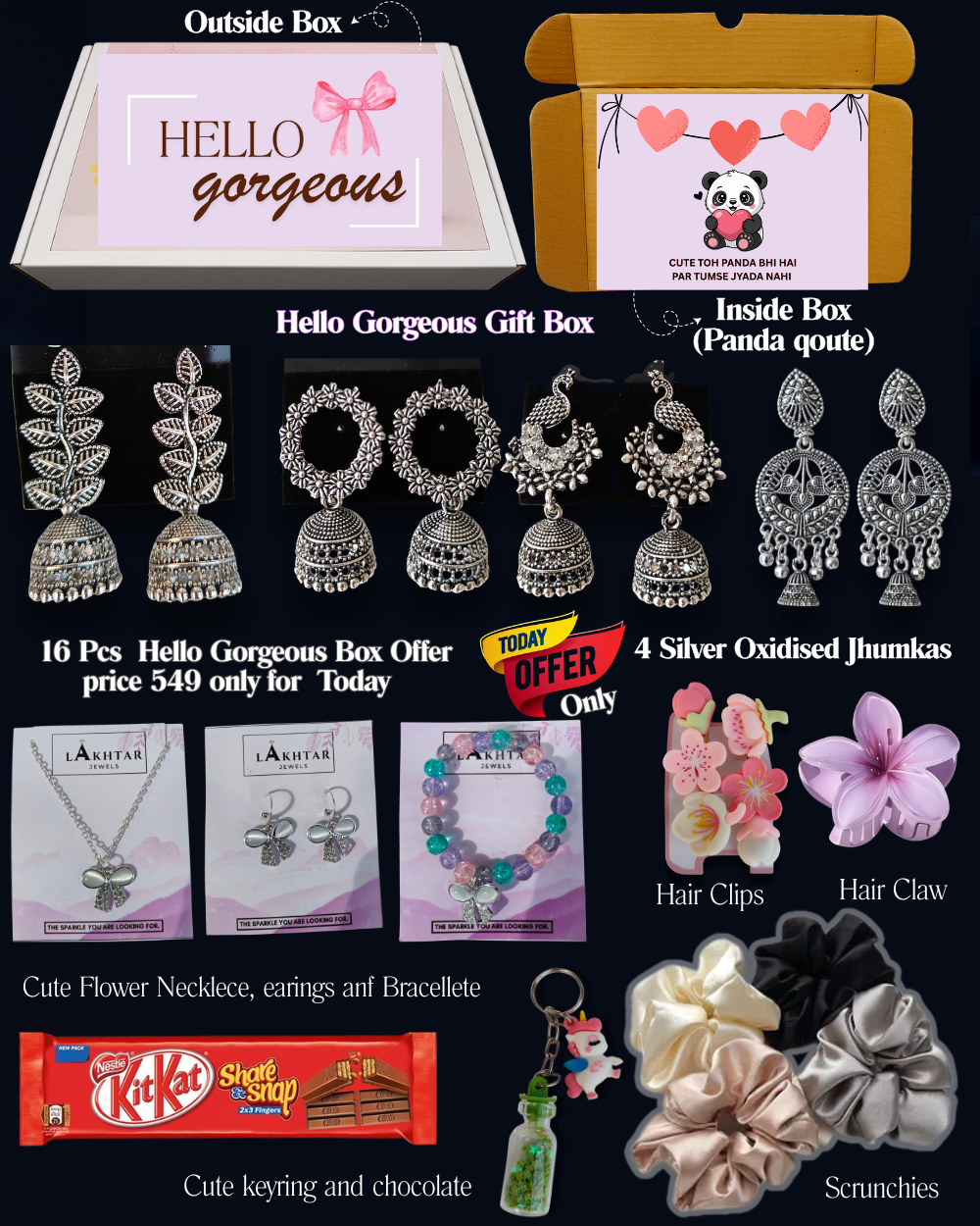 Celebrate her special day in style with this exquisite 16-piece Gift Hamper for girls, beautifully presented in a chic “Hello Gorgeous” box with a heartfelt message inside. This thoughtfully curated collection includes four stunning pairs of oxidised silver jhumkas, a charming floral jewellery set featuring a necklace, earrings, and bracelet, along with soft satin scrunchies, delicate hair clips, and a graceful hair claw for a touch of everyday glamour. To complete the indulgence, the hamper also includes a cute unicorn keyring and a classic KitKat chocolate — the perfect blend of elegance, sweetness, and surprise that makes every birthday truly unforgettable.